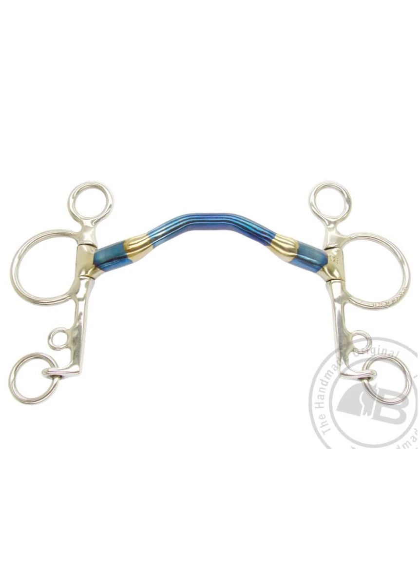 The Pelham has attachments for two reins, one near the mouthpiece and one at the end of the shank. Some riders, may prefer to use rein connectors. The Pelham shank will exert moderate poll pressure and leverage on the mouthpiece and curb. The Happy Tongue is a solid mouthpiece uniquely ported to give maximum tongue relief.