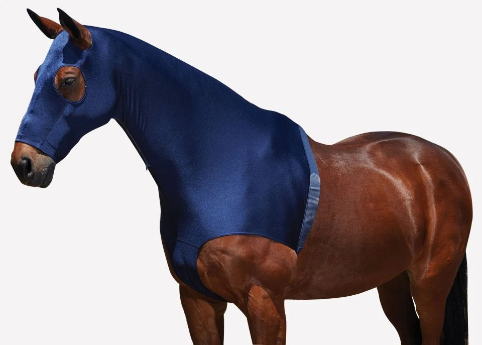 This is one of the better quality head and neck covers. Made from stretch Lycra, it has a good stretch to ensure a good fit without being over tight. It fastens with a zip running up the front of the hood to ease putting on. There is also a belly strap which anchors the hood down, passing through a loop in the fabric that passes between the horse’s front legs (a bit like a martingale) This ensures the hood stays in place. Really useful when preparing your horse for a show the next day.